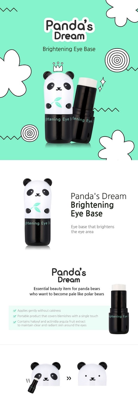 Ilumina tus ojos con Panda's Dream Brightening Eye, un corrector que aclara las áreas oscuras debajo de los ojos, enmascara las líneas de expresión, cuida y mejora la calidad de la piel alrededor de los ojos.